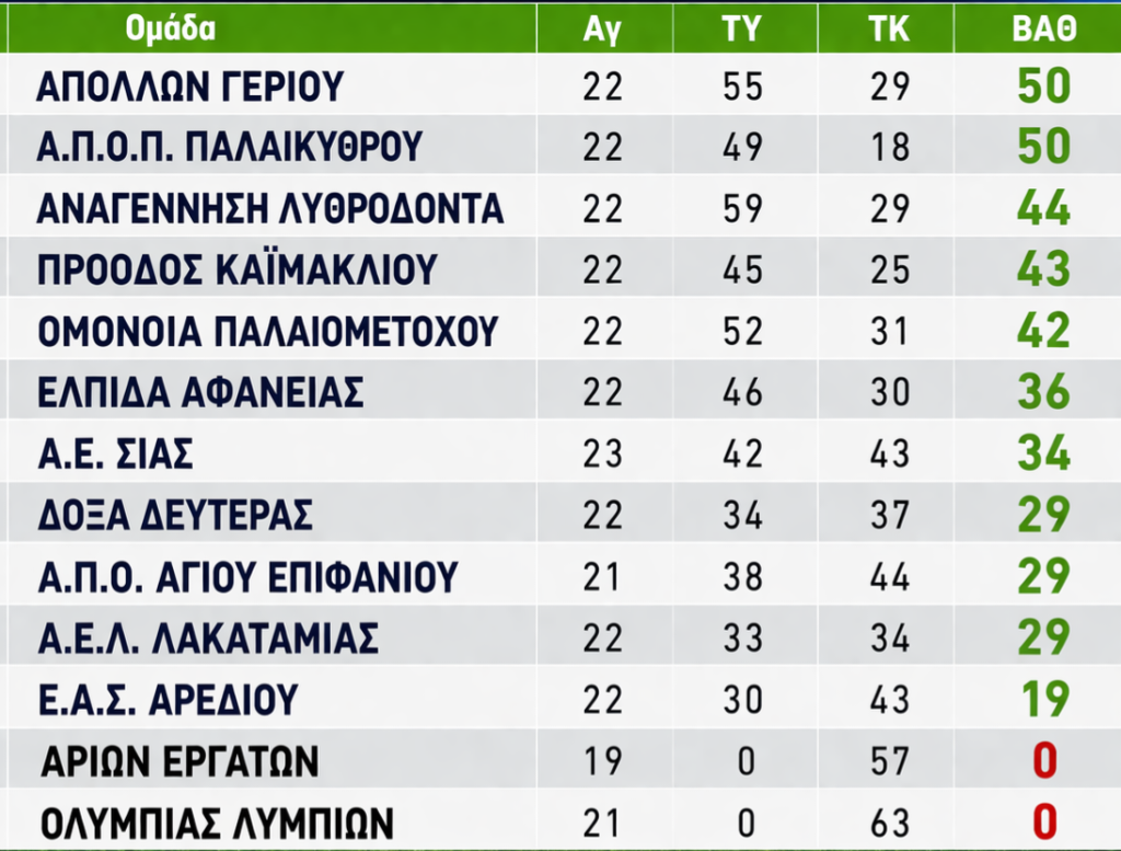 Δύο αγωνιστικές πριν από την ολοκλήρωση του πρωταθλήματος της Α’ Κατηγορίας Π.Ο.Ε.Λ., η μάχη του τίτλου παραμένει ανοιχτή, με τον ΑΠΟΛΛΩΝ Γερίου και τον ΑΠΟΠ Παλαικύθρου να ισοβαθμούν στην κορυφή.
